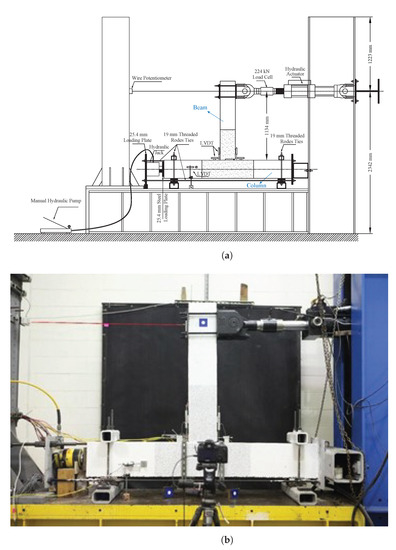 A beam–column connection was selected for investigation due to its significant influence on the strength and overall stability of RC-framed structures, as observed in past earthquakes (e.g., the 1995 Kobe earthquake [17] and 2009 L’Aquila earthquake [18]). A review of the code requirements for beam–column connections can be found in [19]. The behavior of beam–column connections under cyclic loading has been extensively studied (e.g., Refs. [20,21,22]). These studies and many others usefully quantify the global structural performance of these connections, but measurement of detailed mechanical behavior was limited to discrete strain measurements. Further, innovative beam–column connection detailing to limit or control damage is still the subject of ongoing research, and understanding damage propagation in these RC beam–column connections is limited by the constraint of conventional measuring instruments (e.g., strain gauges or Linear Variable Differential Transformers (LVDTs)) [8].