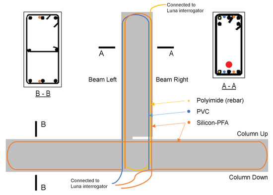 Damage quantification for reinforced concrete (RC) structures require a deep understanding of the mechanical behavior of the structural component. One emerging DFOS technology, Optical Frequency Domain Reflectometry (OFDR), is especially suitable for this task due to its unprecedented spatial resolution (around 1 mm) and high accuracy (around 1 ). Since its appearance a few years ago, it has been used in structural engineering laboratories around the world [7,8,9,10,11]. For a detailed review, please refer to Bado and Casas [12]. Despite the recent advances, the application of DFOS in RC structures is still in its initial stage. Notably, only a few studies (e.g., Refs. [13,14]) investigated the influence of the position of the fiber-optic cable in RC components (e.g., adjacent to rebar or placed at certain distance from rebar). In addition, there is a limited number of detailed investigations (e.g., [15,16]) on the influence of fiber coating (fiber-optic cable jacket) on the sensing results. This paper contributes to addressing the aforementioned challenges by testing an innovative beam–column joint instrumented with DFOS.