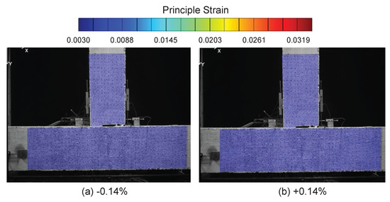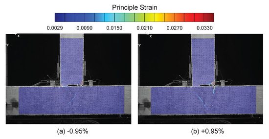 The DIC results at drift levels ±0.95% are shown in Figure 7 and the DFOS results are summarized in Figure 8 and Figure 9. A small amount of energy dissipation could already be observed at this drift level (force–drift relation in Figure 8). In Section 3.1, the DIC at ±0.14% failed to reveal any cracking information. However, at drift levels ±0.95%, the cracks along the left side of the beam were visible through DIC when the left side of the beam was under tension (negative drift, Figure 7a). The locations of these cracks confirm the likely existence of these cracks observed in DFOS at the ±0.14% drift level.