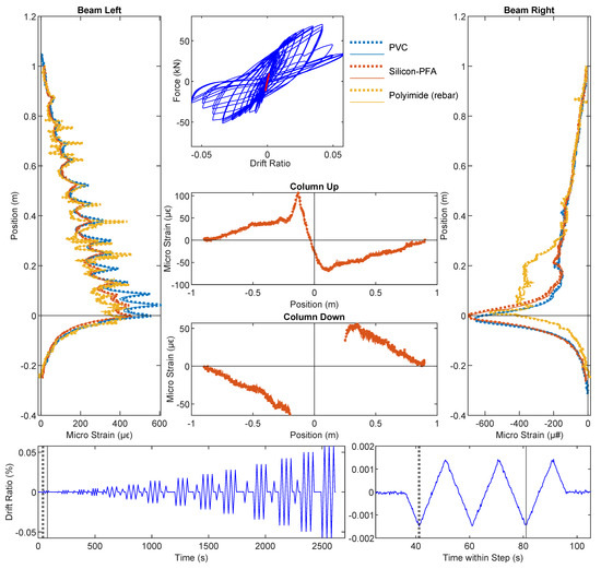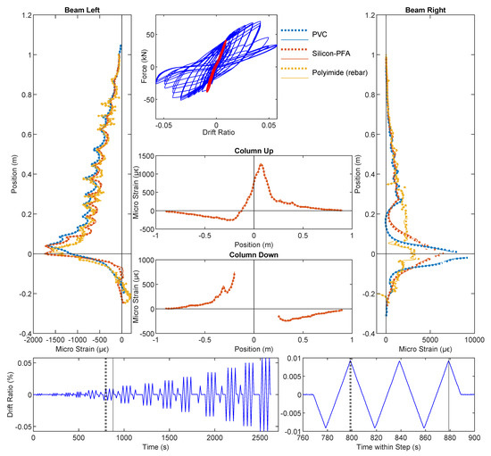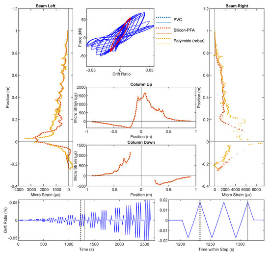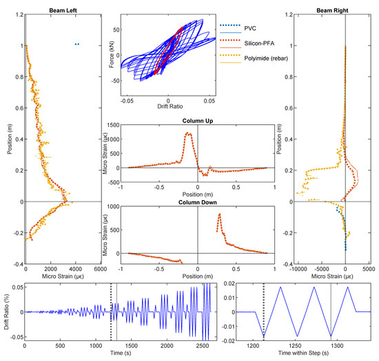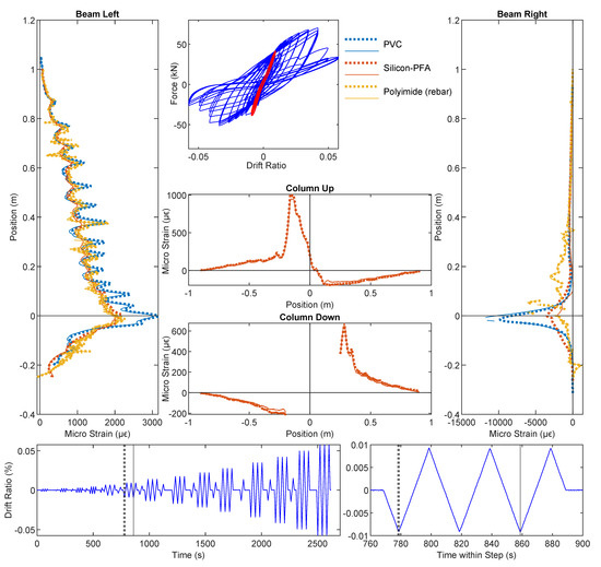 It is worth noting that, even with a significant amount of damage at a drift level of ±1.76%, the strain for the Silicon-PFA cable was still similar to the rebar strain (polyimide) on the left side of the beam (Figure 11 and Figure 12). On the right side of the beam near the slot, the rebar yielded under compression (Figure 11), as noted earlier. Some data were lost at this location, but enough data were still obtained to interpret the behavior. Furthermore, at a drift level of ±1.76% with significant yielding at both sides of the beam, the DFOS results were still repeatable under cyclic loading for the polyimide cable in rebar and Silicon-PFA cable in concrete (Figure 11 and Figure 12). This indicates the feasibility of using these cables for cyclic loading under moderate damage.