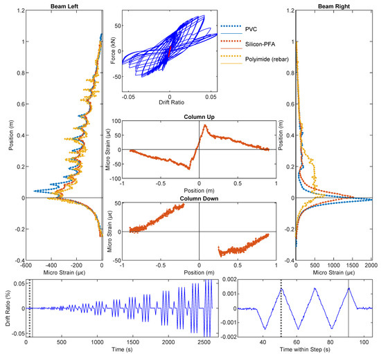 To investigate the influence of cyclic loading on the DFOS measurements, two time instants were distinguished for the same drift level (i.e., the first time and the third time the drift reached the maximum or minimum value for a specified drift level). The two different time instants are indicated by vertical lines in the bottom subfigures in Figure 5 and Figure 6, in which the dotted thick line indicates the first time the drift reached the target level, while the solid thin line indicates the third time. The same line type was adopted to distinguish the DFOS results at these two time instants in subfigures Beam Left and Beam Right as well as Column Up and Column Down (Figure 5 and Figure 6). At this load level, the DFOS results for the first and third cycles coincided for all of the fibers. This reveals that there was no further damage under repeated loading for the current drift level of ±0.14%, and for the current drift level, all three optical cables gave reliable readings under cyclic loading.
