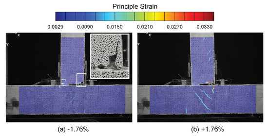 At a drift level of ±1.76%, DIC and DFOS results are presented in Figure 10, Figure 11 and Figure 12, respectively. Energy dissipation under cyclic loading was more prominent at this drift level (force–drift relation in Figure 11 and Figure 12). Compared with the previous drift levels, the DIC results also revealed an increasing number of cracks and larger crack widths (Figure 10), which further indicates an increasing level of damage.