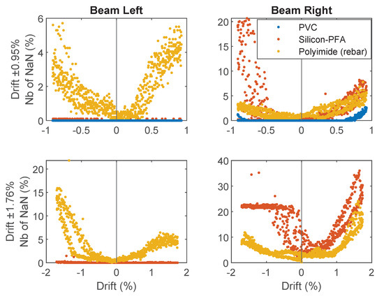 As shown in Figure 13, the percentage of Not a Number (NaN) positively correlated with the drift level. For a maximum drift level of 0.95% on the left side of the beam (without the slot), the PVC cable and Silicon-PFA cable showed similar performances with a few invalid points. For the same drift level on the right side of the beam (with the slot), the maximum percentage of NaN for the Silicon-PFA cable reached 20% under compression (negative drift), while the percentage of NaN points for the PVC cable was still less than 3%. For a maximum drift level of 1.76%, the maximum percentage of NaN for the Silicon-PFA cable reached 35%, but notice that much of the data were still recovered when the strain was reduced again because the cable was not completely damaged. Meanwhile, the PVC cable broke at this drift level (therefore, the data are not shown in the figure).