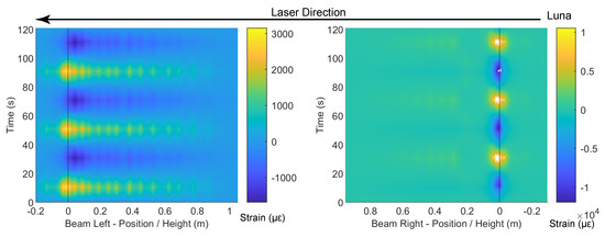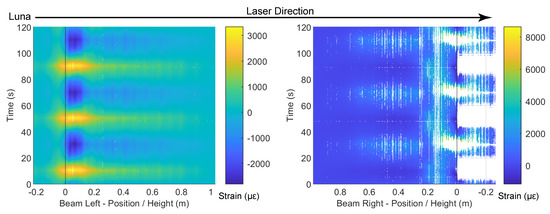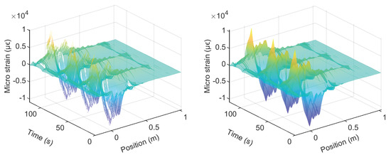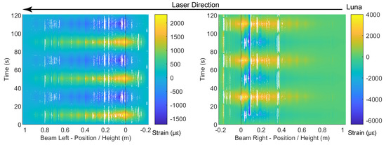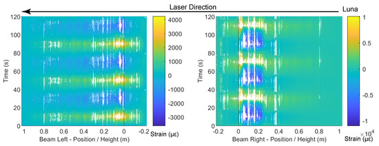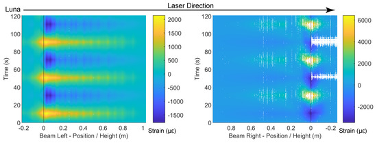 To investigate the location of the invalid points and the influence of the laser direction, the DFOS data are presented in contour plots in Figure 14, Figure 15, Figure 16, Figure 17, Figure 18 and Figure 19. Figure 14 and Figure 15 present the DFOS data for the PVC cable under cyclic loading when the maximum drift was 0.95% and 1.76%, respectively. Note that the direction of the x-axis in the figure is set so that the laser direction is continuous (i.e., the laser enters the specimen from the bottom right side of the beam and exits from the bottom left side (Figure 3)). From Figure 14, three loading cycles can be clearly identified at a drift level of 0.95%. When the drift level increases from 0.95% to 1.76%, because of the cable breakage near the slot, most of the data become invalid. Only the data from the initial portion of the cable (before reaching the breakage point) are partially available.