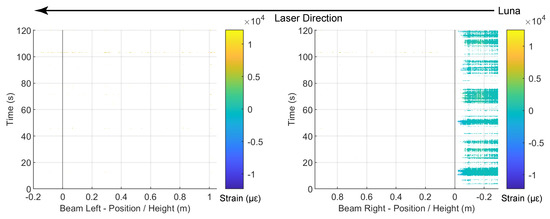 At a drift level of ±1.76%, the data quality deteriorated (i.e., the proportion of non-valid strain readings increased). Strain measurement using the PVC-coated cable was only possible up to the slot location in the beam. The cable must have been damaged at the slot, and no signal was obtained beyond the slot. Meanwhile, strain measurement using the Silicon-PFA-coated fiber was still possible. This was partially caused by the different directions of the cable layout (Figure 3). Starting from the fiber-optic sensing instrument (laser source), the PVC-coated cable entered the beam from the right side (enters the slot), so all data were lost beyond the damage at the slot, while the Silicon-PFA-coated cable entered from the left side and went up along the left side and down along the right side before entering the slot, after which the data were again lost (Figure 11). This observation indicates the possibility of obtaining OFDR results before the damaged part of the fiber but not after it.