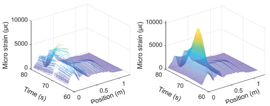 After a disastrous event (e.g., an earthquake), cities are burdened with the need to quickly evaluate infrastructure damage. For modern cities, the indirect cost from business interruption often exceeds the cost from structural damage. Current evaluation procedures for structural damage still largely rely on the judgment of civil engineers, which is expensive and time-consuming. Meanwhile, in recent years, various types of infrastructure-sensing technologies have been developed, such as terrestrial laser scanning [1], unmanned aerial vehicle imagery [2], and distributed fiber-optic sensing (DFOS) [3,4]. DFOS, in particular, has already been successfully applied in civil infrastructure to measure distributed temperature and deformation and to detect damage [5]. However, many previous applications employ BOTDR or FBG technology, which is limited in its spatial resolution. The recent development of DFOS technologies (e.g., pulse pre-pump Brillouin optical time domain analysis (PPP-BOTDA) [6]) bring finer spatial resolution and higher accuracy and frequency, which provides the possibility to more precisely detect local damage and to transform from damage detection to damage quantification.