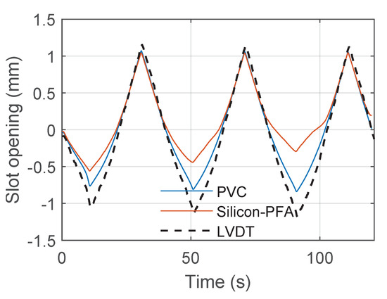 Complete loss of data after the first cycle was also observed for the PVC-coated cable, which is not surprising since less debonding between the PVC cable and the concrete was observed in the previous section. The resulting large strains damaged the cable completely. Meanwhile, only a partial loss of data was observed for the Silicon-PFA cable. Some data were obtained “beyond” the slot for both the first and third cycles (Figure 12). Some debonding likely protected the cable from complete damage.