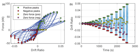 - Negative peaks: the loading instants corresponding to the minimum drift at each loading cycle;