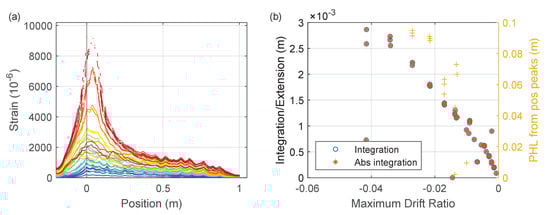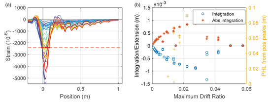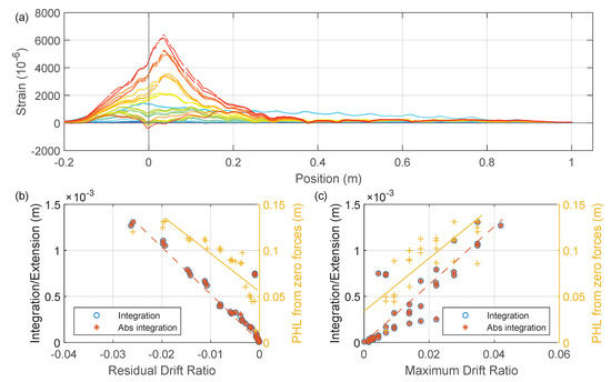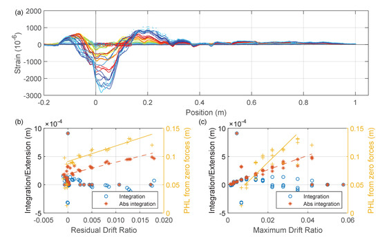 Figure 28a presents the residual strain distribution when the force returns to zero after a positive peak, while Figure 28b,c provide the correlation between the defined indices (calculated from the residual DFOS strain when the force is zero) and the residual or maximum drift. Note that while “integration” and “abs integration” have the same definition as before, “PHL from zero force” is defined as the length between the beam end and first zero crossing point of the strain profile (distance between circles in Figure 28a).