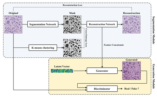 - The generation module generates pathological images from the features of the segmentation module and latent vectors by the embedding feature concatenation method.