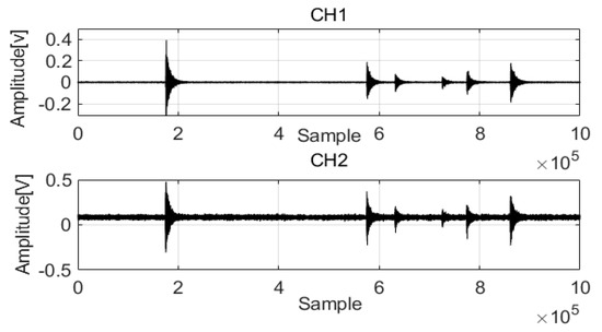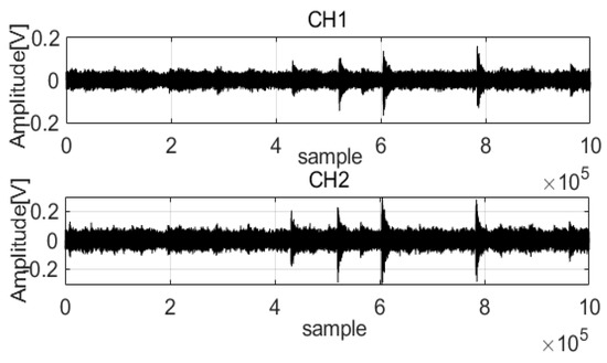 To verify the performance of the proposed method, many acoustic wave data from pipelines were used in the analysis (data parameters: leak size 0.5 mm, pressure 18 bar). Figure 8 shows the acoustic wave acquired from two channels (CH1 and CH2). Noise was present in the acoustic waves and was mixed with the feature signals, complicating analysis. To extract the feature signals, a length equal to 1,000,000 data points was considered.