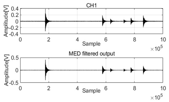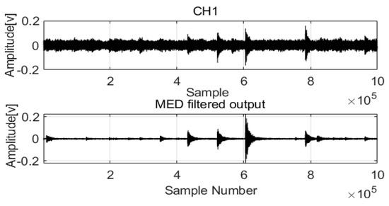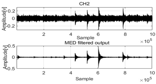 The original signals were processed by MED to remove noise, and the two filtered signals were compared. The results are shown in Figure 9 and Figure 10.