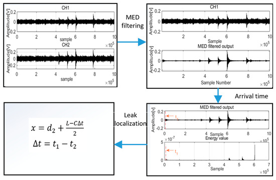where c is the velocity, L is the distance between Sensor 1 and Sensor 2, is the first arrival time for acoustic waves in Channel 1, is the first arrival time for acoustic waves in Channel 2, and x is the leak location. The whole process of the architecture is shown in Figure 6.