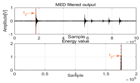 After MED processing of acoustics signals in two channels, a new method was designed to detect the first arrival time. For damping frequency energy, the damping ratio is typically selected as impulse waves; at this damping energy level, the frequency response approaches the Butterworth maximally flat magnitude filter. With these special frequencies and damping energy, the architecture can achieve equilibrium quickly, and the relative motion of the mass is extremely small, which is an advantage of the system. The damping energy with frequency is a cumulative function that is proportional to the square of the relative velocity, and it can produce a smooth envelope over time. Before the first arrival of the acoustic waves, the frequency energy valve is zero or near zero, and the first arrival time can be detected as shown in Figure 4 and Figure 5.