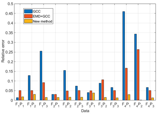 To further validate the performance of the proposed method in industrial pipelines, data were applied to compare the GCC and EMD + GCC methods with the proposed method. The computational result is shown in Figure 13 and Figure 14.