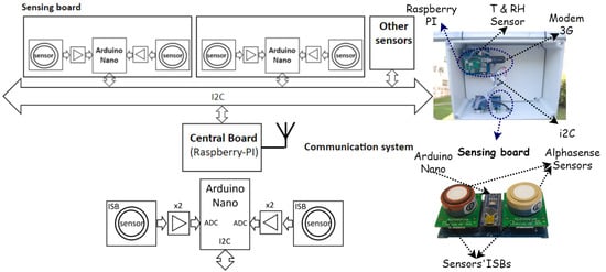 Air pollution data capture prototype Captor node on (top), and the Captor’s sensing board on (bottom). The prototype node has a Raspberry-based central processing unit connected to the sensing boards via an I2C bus. Each sensing board has an Arduino Nano microcontroller unit in charge of collecting the measurements from the electrochemical sensors and sending them to the Raspberry unit. The collected samples are then transmitted to the cloud via a 3G modem.