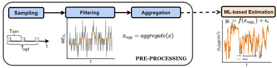 In this section, we show the different steps required to obtain air pollution estimates from low-cost sensors. The whole sensor data gathering process can be divided into two stages; sensor data pre-processing, and the estimation of pollutant concentrations using a supervised machine learning algorithm. All data pre-processing can be performed at the sensing node so that only measurements synchronized with the reference values are transmitted to the cloud, and the subsequent estimation of pollutant data is performed off-line. It is important to note that, to estimate the final pollutant concentration, the machine learning algorithm, as described in Section 4.2, uses a combination of samples taken by several sensors of the same node. This edge computing approach significantly reduces the amount of data transmission required, since only the aggregation of collected data is sent to the cloud. From now on, we focus on how to reduce power consumption in the sensing subsystem when taking samples. Figure 2 illustrates all the required pre-processing steps to be able to perform the sensor data gathering procedure.