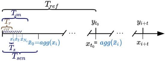 Sensor sampling scheme used throughout the article. are the sensor measurements while are the reference data measurements. Every , the sensor is sampled by waiting for the sensor response time and collecting the samples to be aggregated. These samples can be further aggregated into to synchronize them with the reference values.