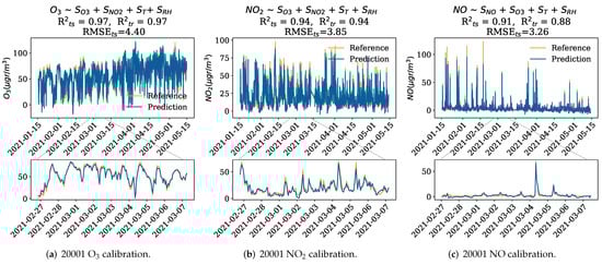 Figure 4a shows the results of the calibration of the Captor 20001 O sensor using the multiple linear regression model. As can be seen, the test Rs is very good, specifically 0.97, with root-mean-square errors (RMSEs) of 4.40 and 4.22 in the case of the Captor 20002 O sensor. Figure 4b shows the calibration results for the Captor 20001 NO sensor, where the model obtains a testing R of 0.94 with RMSE of 3.85 , similarly Captor 20002 NO sensor achieves a testing R of 0.93, with an RMSE of 4.14 . Finally, Figure 4c shows the calibration for the Captor 20001 NO sensor, with a testing R of 0.91 and a testing RMSE of 3.26 . The calibration of NO is very dependent on the data used for calibration and testing, as NO has very abrupt peaks, it is important that there is data in the training that represents these peaks. Hence, the calibration goodness-of-fit depends on the pollution peaks observed during the training and testing periods. The nonlinear methods (support vector regression and k-nearest neighbors) performed similarly to the MLR given that the sensors’ responses are quite linear. In fact, the support vector regression obtained a R of 0.98 for both O sensors, R of 0.96 and 0.94 for the 20001 NO and 20002 NO sensors, and a R of 0.97 for the NO sensor, while the k-nearest neighbors obtained a R of 0.96 for both O sensors, R of 0.94 and 0.92 for the 20001 NO and 20002 NO sensors, and a R of 0.95 for the NO sensor.