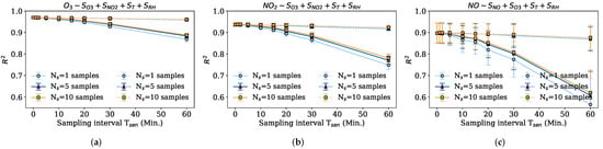 Figure 5b shows a similar pattern for the NO sensor, but with a larger decrease in R for large sampling intervals. Indeed, the R is observed to remain almost constant for , with values around 0.94. However, the worsening in this case is much greater than in the case of O, since at the R is reduced to 0.86, and at to 0.75. Regarding the number of samples taken every period, it is seen that one sample is not significant enough, so this sampling setting works worse than the others for sampling intervals larger than 10 min. In addition, since NO is a less smooth signal than O, with few samples per interval, there is greater variability, which explains the higher confidence interval values for . Finally, for the uniform sampling approach, the same trend is observed for NO as for O, where five to ten uniform samples over obtain very good data quality.