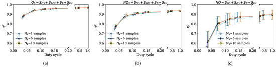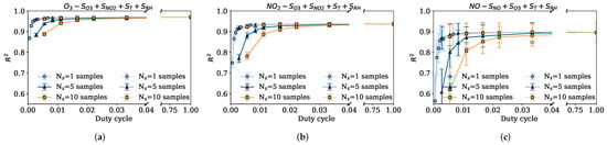 The results of the duty cycle for a 2 min sensor response time () and therefore with a are shown below. Here, only the results of the strategy that takes the measurements sequentially are shown, since with a sensor response time of two minutes it is no longer possible to take samples uniformly as the node would always be powered on. Recall that low duty cycles correspond to large and fewer samples taken in the interval . This can be seen in Figure 7a–c, where lower R are obtained for low duty cycles. The coefficients of determination start to stabilize at (). Thus, a sampling period of about five or ten minutes guarantees the representativeness of the sampled data. When the physical phenomenon presents large variability, as in the case of NO, the confidence intervals are poor. However, large periods with one single sample introduce more variability, as observed in the confidence intervals of sampling strategies with . In this case, it is better to take more samples, slightly increasing the duty cycle, since the sensor response time is the one that dominates the duty cycle.