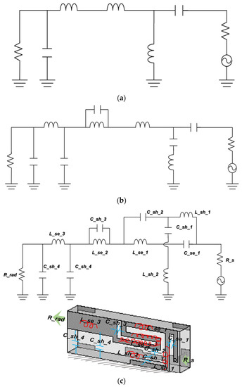 There are three circuit models in Figure 3. The form of the basic CRLH circuit is made up of a series, such as an inductor (L) and capacitor (C), and shunt L and C, as in Figure 3a [22,23,24,25]. With more elements added to the simple CRLH circuit, it can provide more functions, and it is called the extended CRLH (E-CRLH) circuit [26,27]. As shown in Figure 3b, the E-CRLH needs to evolve to one with a higher degree of inter-element coupling generated in a real metal-patterned device. Figure 3c presents an E-CRLH equivalent circuit and the initial shape of its geometrical rendition. The roles of the circuit elements C_se_1, C_sh_2, C_sh_4, L_se_2, L_sh_1, C_sh_1, C_sh_3, L_se_1, L_se_3, L_sh_2, R_s and R_rad can be mapped into inductive or capacitive parts of a dielectric rectangular prism. As is desired for physical miniaturization, the metallic pattern as the current path on the surface of the dielectric prism should be divided into the main line and stubs. The main line of the structure starts from the power supply and R_s through C_se_1, L_se_1, L_se_2, L_se_3, C_sh_3 and C_sh_4 to R_rad. L_sh_2 is with the stub on the top surface. The stub on the bottom surface of the prism consists of L_sh_2. The three line segments are coupled through C_se_1, C_sh_1 and C_sh_2. More specifically, C_se_1 occurs between the main path and the upper stub, and C_sh_1 is the capacitive coupling between the upper and lower stubs. From the lower stub to the main path, the coupling is represented with C_sh_2. On the main line, the current flows with inductances L_se_1, L_se_2 and L_se_3. The current created on the upper stub goes with L_sh_2. The lower stub lets the current flow with L_sh_1. These circuit elements are figured out by having their E-CRLH model meet the resonance condition at the target frequency. The values of the inductors and capacitors, at the time, are tabulated as follows.