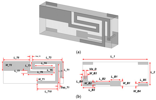 Ahead of this section, the equivalent circuit was built to resonate at the BLT frequency with the circuit elements in Figure 3c and Table 1. In the phase of realization, the current flowing line segments become the metallic pattern on a rectangular dielectric cube with the circuit elements.