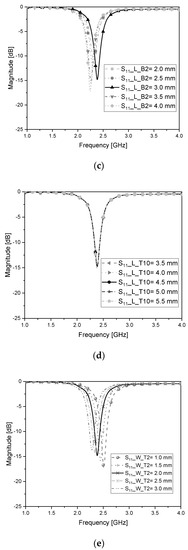 The metalized TX-line segments are formed on the 0.018-mm-thick copper surfaces of FR-4 as a 2-mm thick dielectric material with an εr of 4.3 and a loss-tangent of 0.025, as in Figure 4a. The structure is given geometrical parameters named L_T1, L_T3, L_T5, L_T7, L_T9, W_T1, Gap_T1, L_T2, L_T4, L_T6, L_T8, L_T10, W_T2 and Gap_T2 for the top surface, as seen in the left side of Figure 4b. The top surface is connected through a via to the bottom surface, which will sit on the substrate of the electronic circuit board. The bottom surface, on the right side of Figure 4b, goes with L_1, L_B1, L_B3, L_B5, W_B2, Via_D, L_2, L_B2, L_B4, W_B1, W_B3 and H. To comply with the functions of the circuit elements of the E-CRLH model, parametric studies are carried out. As for the main line, for the upper stub and lower stub, that is, the metalized line segments, aiming for resonance at 2.45 GHz, three representative geometrical parameters L_B2, L_T10 and W_T2 are chosen and adjusted in the course of parametric sweeps. Figure 4c shows the behavior of S11 as L_B2 is varied from 2.0~4.0 mm. Since this parameter is next to the feeding area, this variation increases shunt capacitance and series inductance, which results in the change in the position of the dip. In Figure 4d, though L_T10 becomes longer, the curve of S11 does not move. It is inferred that this parameter makes a loose coupling with the neighboring parameters but helps them with impedance matching. The end part of the main line has W_T2 as the width and it is varied from 1.0~3.0 mm, as in Figure 4e. Its variation causes a change in resonance frequency. Between the wide and narrow cases, there exists an optimal value for W_T2 because it works like the element for shunt capacitance and series inductance of the main line, and radiated field as well. After going through this work, the resonance characteristics of the input reflection coefficient from the antenna are obtained, as demonstrated in Figure 4f with the physical dimensions written in the Table 2.