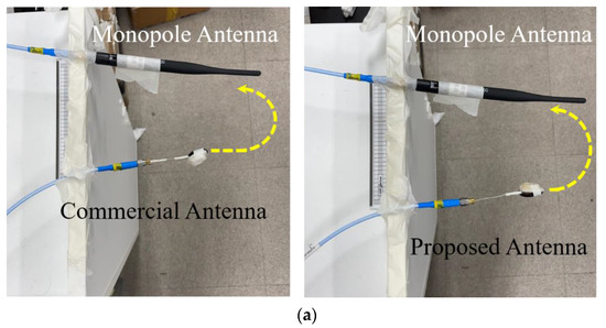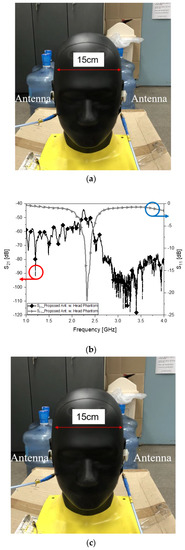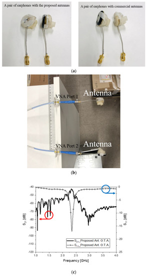 Figure 6a shows the proposed antennas and other antennas, respectively, combined with the earphones. The direct link (over-the-air, OTA) based on resonance leads to S21 = −41 dB, which is relatively good connectivity over a 15-cm gap, as seen in Figure 6b,c. Contrarily, the commercial antennas in the earphones have poor resonance results in S21 = −45 dB in Figure 6d,e. Therefore, the contributed antenna is superior to the commercial antenna and will be apparent in the next phase of the experiment, which is more realistic.
