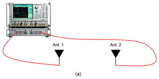The commercial BLT antenna is characterized in the same manner. The gap between the DUT and the reference antenna is given 10 cm. The left side of Figure 9a presents the proposed antenna and the reference antenna connected to the ports of the VNA through cables, whose model name is 21SK252 3000 mm. On the right side of Figure 10a, the commercial BLT antenna and the reference wire antenna are used for the same type of test. Figure 10b presents that the transmission coefficient of the proposed antenna case is −28 dB which is 17 dB larger than that of the commercial antenna, even though the metamaterial antenna has a smaller size, 13 × 4.8 × 2 mm3, than the commercial antenna at 15 × 6 × 1.2 mm3.