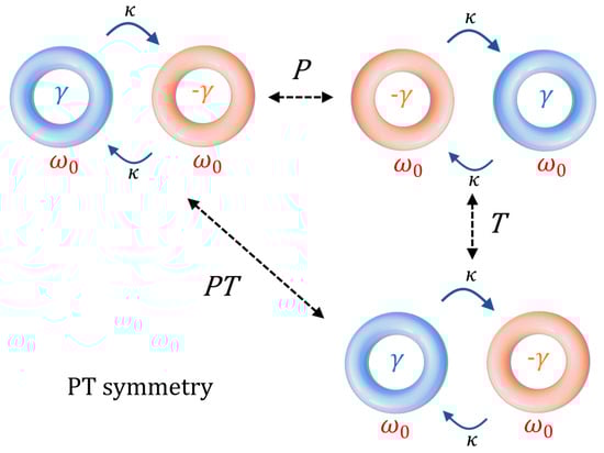 Graphical interpretation of PT symmetry in coupled resonators: γ represents the loss term, ω0 is the resonant frequency of each resonator, and κ is the coupling strength between the resonators. The system is invariant under simultaneous applications of the parity and time operations.