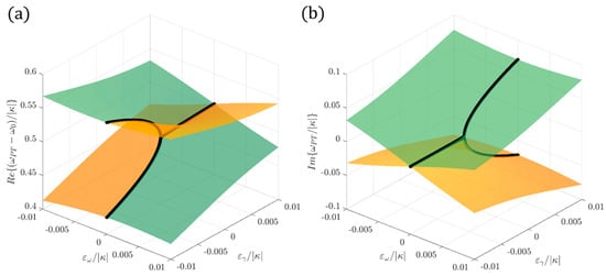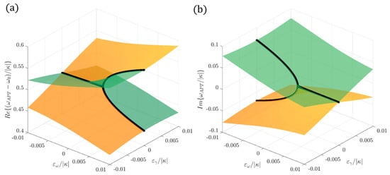 Figure 4 shows the real part (Figure 4a) and the imaginary part (Figure 4b) of the eigenfrequencies of an anti-PT-symmetric Hamiltonian for different values of the perturbations εω and εγ in the proximity of an EP. Black lines identify the region where εγ = 0: it is possible to appreciate the square root dependence on εω in the proximity of the EP.