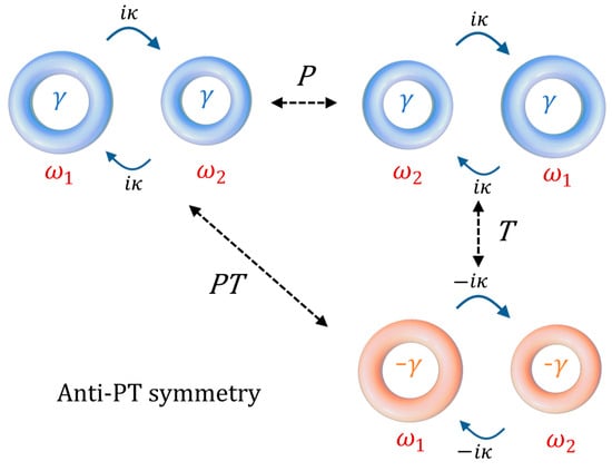 - Yang, F.; Liu, Y.-C.; You, L. Anti-PT Symmetry in Dissipatively Coupled Optical Systems. Phys. Rev. A 2017, 96, 053845. [Google Scholar] [CrossRef]