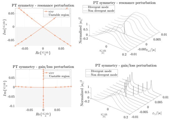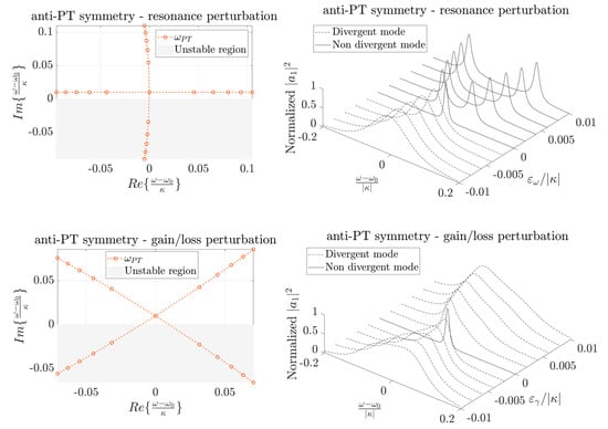 Figure 5, on the left column, shows the trajectories of the eigenfrequencies on the Gauss plane (Re{ω}, Im{ω}) for PT-symmetric and anti-PT-symmetric configurations in the presence of the perturbation of the resonance or of the gain (or loss) of one of the resonators. The grey half-plane represents the unstable region, i.e., the region where eigenfrequencies should not lie in order to prevent instability. As soon as one eigenfrequency lies in the unstable plane, the system becomes unstable, due to the presence of at least one divergent mode. The right column of Figure 5 shows the normalized energy in one of the resonators (proportional to a measurable output of the system) as a function of the normalized angular frequency and for the same values of the perturbations used in the corresponding graph on the left column. To obtain the normalized graph in the right column of Figure 5, input amplitudes sin1 = 1 and sin2 = 0 have been considered.