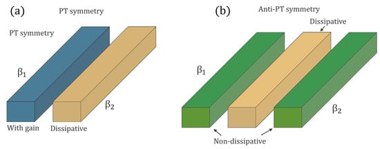 Optics has been the most fertile branch of physics for the investigation of non-Hermitian Hamiltonians [,,,], starting from the work by Ruschhaupt et al. []: since the Schrödinger Hamiltonian is PT symmetric, provided that its potential (V) satisfies the condition V(r) = V*(−r) (with r the position vector), and since the refractive index plays the role of an optical potential in the spatial diffraction equation (isomorphic to the Schrödinger equation []), a refractive index with a symmetric real part and an antisymmetric imaginary part guarantees PT symmetry in optics. Later, in [], a new class of synthetic photonic systems was investigated, with the antisymmetric refractive index (n(r) = −n*(−r)) under the joint P and T operators, defined as “antisymmetric parity-time (APT)”. An anti-PT-symmetric Hamiltonian (as it later has been called) satisfies the anticommutation relation {Ĥ, PT} = 0 [] and can be realized without the necessity of gain.