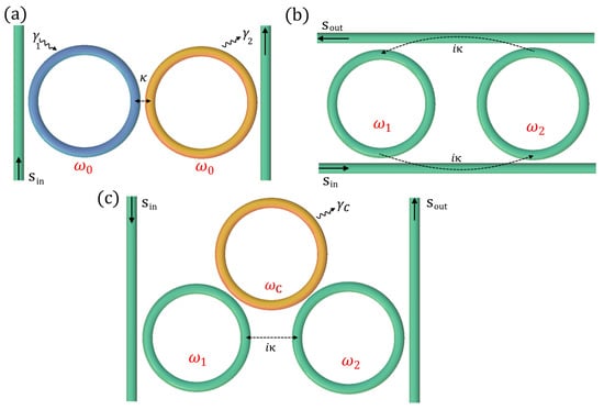 where ωc,1 and ωc,2 are the complex resonances of two resonators (ωc,1(2) = ω1(2) + iγ1(2)), with ω1(2) the real resonance frequency and γ1(2) the decay rate in the resonator), and κ12 and κ21 are the coupling strengths between the two resonators.