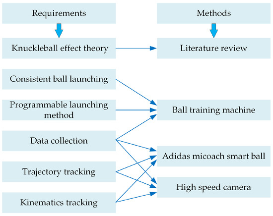 Based on these design requirements, we firstly acquired a comprehensive understanding of the knuckleball effect through an extensive literature review and analysis of existing theoretical models. We then designed the physical system based on reducing human error and prioritizing accuracy and consistency. For this, we opted for a computer-based system which consisted of a ball training machine that had programmable functions and the Adidas miCoach Smart Ball which had internal sensors that could produce kinematic data of the ball. We also supplemented the smart-ball data with video-based data collection of the ball’s trajectory through implementation of a multi-camera system on the field. Figure 1 is a diagram that summarises the requirements and the corresponding methods used in this research.