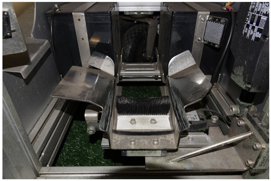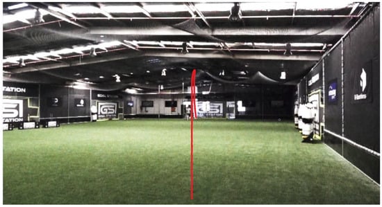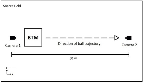 To observe the full trajectory of the ball, the BTM was set up to shoot across the testing area, as opposed to shooting towards a goal. The distance between the cameras was approximately 50 m. The motion of the ball was recorded using two high-speed Sony RX10 III cameras. The footage was captured at a rate of 500 fps and a resolution of 1920 × 1080 pixels (×10 slow motion). Cameras were placed both behind and in front of the launcher, as shown in Figure 10, to observe the lateral deviations of the ball. As there was no external trigger available, each camera had to be manually triggered to record the data. We used Tracker video motion analysis and modelling software to visualize the trajectory of the ball in the videos. Tracker [35] is an open-source video analysis and modelling tool built on the Open-Source Physics (OSP) Java framework. Its main features include object tracking with position, velocity and acceleration, centre of mass tracking and vector analysis.