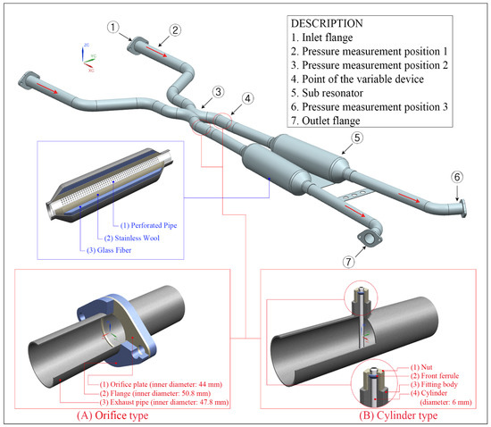 Figure 1 shows the design of the prototype exhaust system and variable devices used in the experiment. Descriptions of the designed exhaust system and each position are provided in the figure, and the structures of the variable devices and sub-resonators used in the exhaust system can be seen.