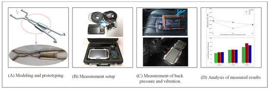 Schematic diagram of the experimental procedure. (A) Exhaust system design and prototyping; (B) back-pressure and vibration measurement settings; (C) back-pressure and vibration measurement; (D) analysis of measured results.