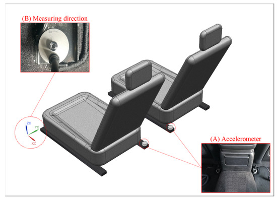 Table 4 shows the specifications of the equipment used to measure the precise vibration of the vehicle body. The acceleration sensor used for vibration measurement was of the piezoelectric type, and ICP Triaxial Accelerometer manufactured by IMI was used. ISO 2631-1 was referred to for vibration measurement, and accelerometers were installed in the driver’s seat and the passenger seat, as shown in Figure 4A. Figure 4B shows the measuring direction. The Z-axis represents the vehicle body direction, X-axis represents the engine direction, and Y-axis represents the door direction [23,24,25,26]. Vibration is insufficient to quantify physical effects on the human body. Therefore, the vibration velocity level is expressed as VdB, and the VdB is a logarithmic scaling of vibration magnitude.