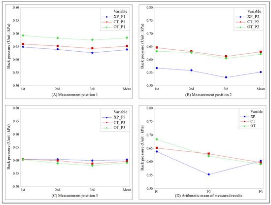 Figure 5A shows the results measured at pressure measurement position 1. It can be seen that the orifice and cylinder types exhibited higher pressure than the conventional X pipe (XP) type. Based on the average value of the three measurements, the XP type showed 0.638 kPa.