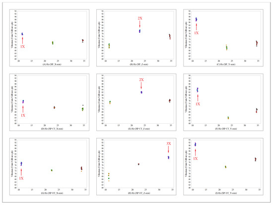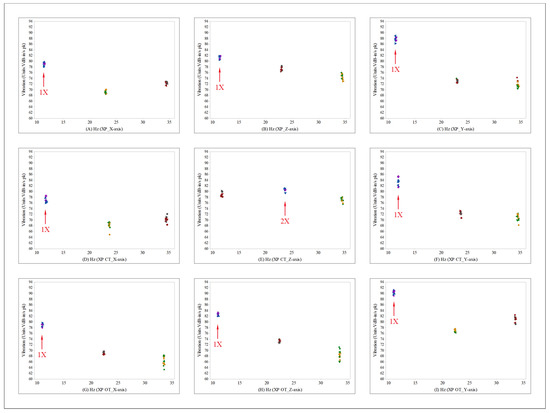 Figure 8 shows the results measured in the passenger seat in scatterplots. In the figure, the XP type is shown in (A–C), and the cylinder type is shown in (D–F). The orifice type is shown in (G–I). The vibration in the X-axis direction is shown in (A,D,G); the 1X component exhibited the largest vibration. The vibration in the Z-axis direction is shown in (B,E,H). The 1X component exhibited the largest vibration in (B,H), whereas the 2X component exhibited the largest vibration in (E). The vibration in the Y-axis direction is shown in (C,F,I); the 1X component showed the largest vibration. Therefore, in Figure 8, the largest vibration also occurred on the Y-axis, and the 1X component was the main vibration source. The scatterplot in the Y-axis decreased for the cylinder type, compared to the conventional XP type, whereas the scatterplot in the Y-axis increased for the orifice type.