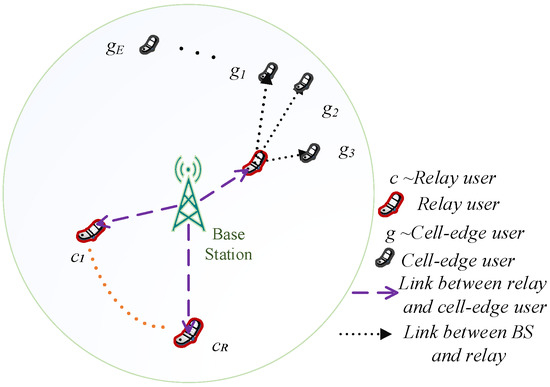 The system has relays and cell-edge users. The set of relays is denoted as = {}, and the cell-edge users set is represented as Ğ = {}. It is presumed that each user equipment (UE) has a different battery level modeling for the practical scenario. The battery of the relay, where , is denoted as . A Rayleigh fading scenario is considered where the BS superimposed the signals of the cell-edge user or sends it to . In the cooperative NOMA system, the BS and the relay are assumed to have achieved absolute channel state information (CSI At a time, forwards the signal to maximum cell-edge users, and its set is denoted by = {}, such that and ).