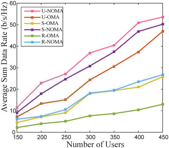 The data rate achieved at in the NOMA system is given as . The data rate achieved at in the OMA system is given as , where the channel gain of the link between BS and is represented by , and is the transmitted BS power for . The OMA achieves more interference than NOMA; hence, the achievable capacity in the case of OMA is less than NOMA. With a varying total number of users in the cell, Figure 2 presents an average sum rate analysis of cell-edge users in different deployment scenarios.