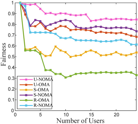 - Wei, Z.; Guo, J.; Ng, D.W.K.; Yuan, J. Fairness Comparison of Uplink NOMA and OMA. In Proceedings of the 2017 IEEE 85th Vehicular Technology Conference (VTC Spring), Sydney, NSW, Australia, 4–7 June 2017; pp. 1–6. [Google Scholar]