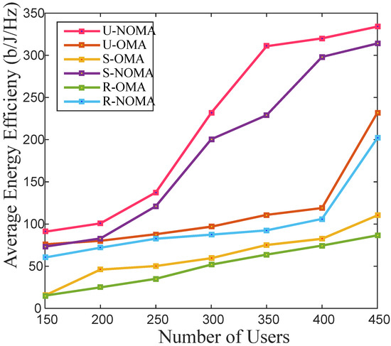 For 5G, power-saving and energy optimization in the communication system are crucial. The energy efficiency of the link between the BS and cell-edge user in a coordinated relay OMA and NOMA system is shown in Figure 4. It is found that the average energy efficiency takes an upswing with the rise in the cell users. Energy efficiency is a function of achieved data rate and equipment power consumption. It is observed from Figure 2 that the rate in the rural scenario is the poorest; therefore, its energy efficiency is also the least, as seen in Figure 4. The NOMA scheme serves multiple users simultaneously, whereas OMA can use servers one user at a time. Therefore, the NOMA scheme outstrips the OMA scheme in terms of average energy efficiency.