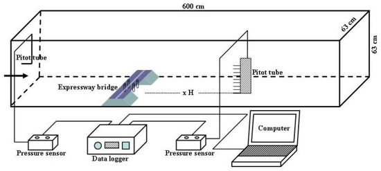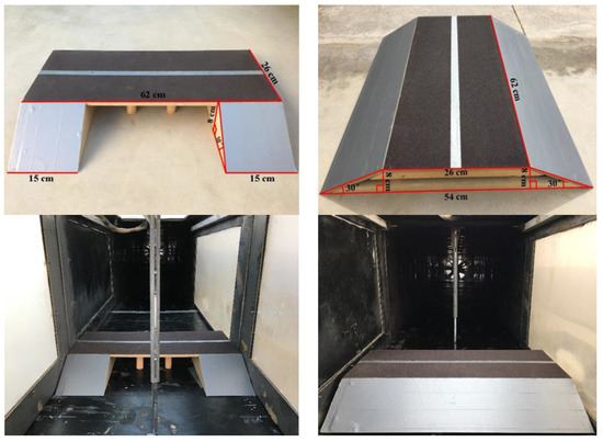 The expressway pavement width is 26 m and the slope ratio is 1:1.75, following expressway technical standards. The subgrade and bridge models of the wind tunnel test were constructed at a 1:100 scale, based on previous studies [20,21]. The wind tunnel used for the test had a cross-section of 63 cm × 63 cm and a boundary layer thickness of 12–15 cm. Therefore, the bridge and subgrade models were both 8 cm in height and 62 cm in length, and their blockage ratios were 7.1% and 12.5%, respectively. The model sizes are shown in Figure 1.