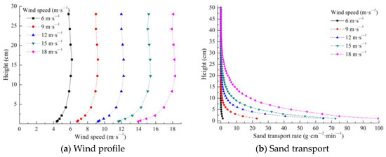 Simulation experiments in wind tunnels should generally satisfy the principles of geometric similarity, kinematic similarity, and dynamic similarity [22,23]. In this wind tunnel experiment, the sand used was taken from the original surface sand of the desert, conforming to geometric similarity. The bridge and subgrade are models made according to equal-scale reduction, also conforming to geometric similarity. The bridge and subgrade models were placed within the boundary layer of the wind tunnel test section, the pitot tubes were arranged at the bottom center of the wind tunnel test section, and the measured initial wind speed profile was consistent with the distribution law in nature (Figure 3a). Thus, this experiment conforms to kinematic similarity. In the model, the sandy bed surface was laid upwind, and the sand collector was set downwind. The measured initial sand transport rate was consistent with the distribution law in nature (Figure 3b), indicating that this experiment conforms to dynamic similarity. Therefore, this investigation satisfies the principles of geometric, kinematic, and dynamic similarity of wind tunnel simulation experiments to the greatest extent.