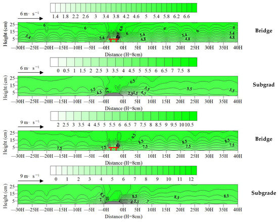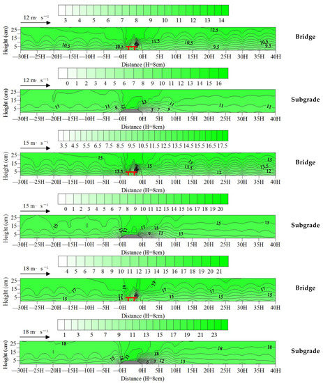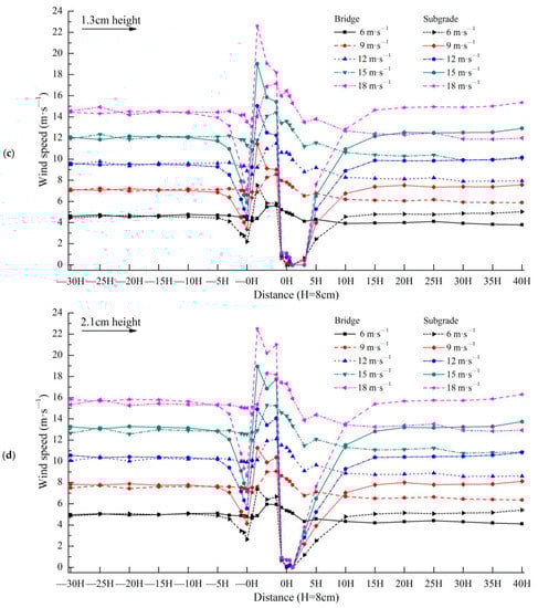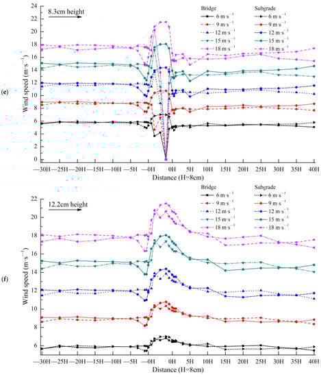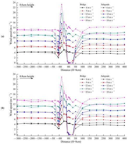 In this test, the height of the model was set to 8 cm. Owing to the gap in the bridge, a minimal blocking effect was observed on the near-ground airflow below this height. When the airflow ran near the bridge, it passed through the gap at the bottom of the bridge. The disturbance received by the airflow was small. Therefore, the variation range of the wind speed was small, similar to the wind speed and flow field of a railway bridge [21]. Under the same experimental conditions, because no gap existed in the subgrade, it had a considerable blocking effect on the airflow near the ground. When the airflow ran in the −5H to −0H range upwind of the subgrade, it can only pass through the top of the subgrade with obstructions, resulting in considerable disturbance. Therefore, the wind speed decreased significantly. When the airflow ran to the windward side of the subgrade, the wind speed increased fleetingly with a climbing windward slope and reached the maximum value when it ran the shoulder of the windward slope. Thus, the wind speed increased significantly. When the airflow passed over the top of the subgrade, due to the terrain decrease of the leeward slope, the airflow dispersed rapidly and the wind speed dropped sharply. The wind speed dropped to the lowest value (0 m·s−1 or close to 0 m·s−1) within 0H–3H downwind of the subgrade, and the wind speed dropped significantly. Then, as the distance increased, the influence of the subgrade on the airflow weakened and the wind speed recovered quickly. Consequently, the wind speed of the subgrade varied sharply, and the variation range was significantly higher than that of the bridge. Above 8.3 cm, with the increase in height, the influence of the bridge and subgrade became smaller and the airflow was less disturbed. Therefore, the wind speed difference between the bridge and subgrade became smaller, the variation trend of the wind speed was the same, and the variation range decreased.